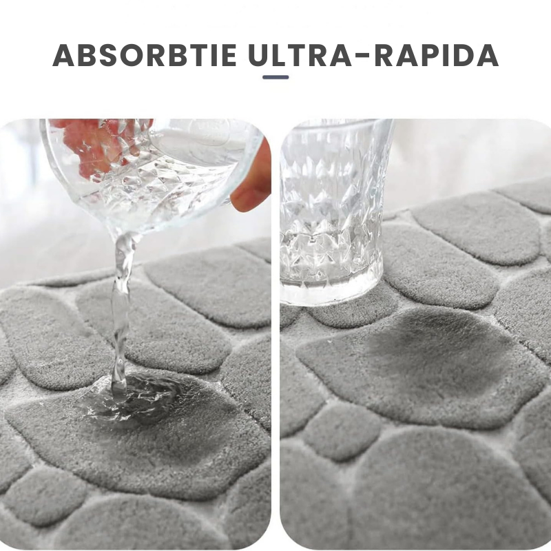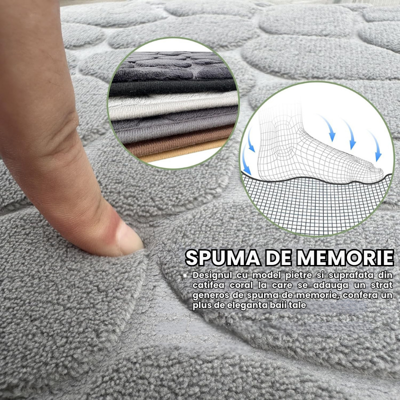 • Suprafata Confortabila din Catifea Coral: Designul cu model pietre si suprafata din catifea coral adauga un element de eleganta si confort in baia ta, transformand fiecare pas intr-o experienta placuta si relaxanta.