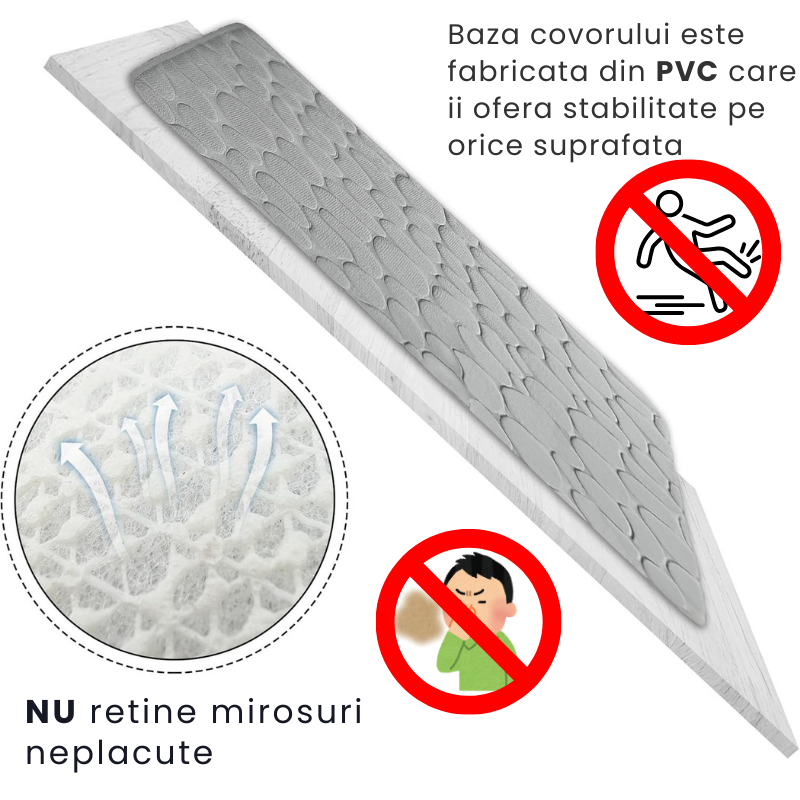 • Anti-Derapant: Dispune de un strat anti-derapant pe partea din spate, asigurandu-se ca covorasul ramane ferm fixat pe podea si oferindu-ti siguranta in timpul utilizarii.